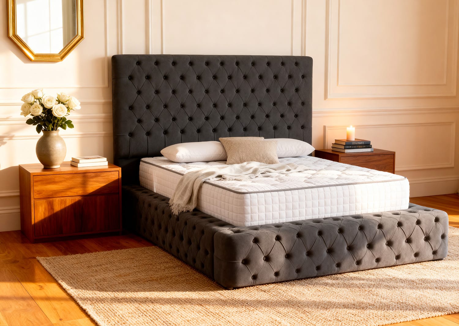 A premium upholstered bed with a tall, elegant headboard and a plush finish — ideal for a modern, hotel-style bedroom.
