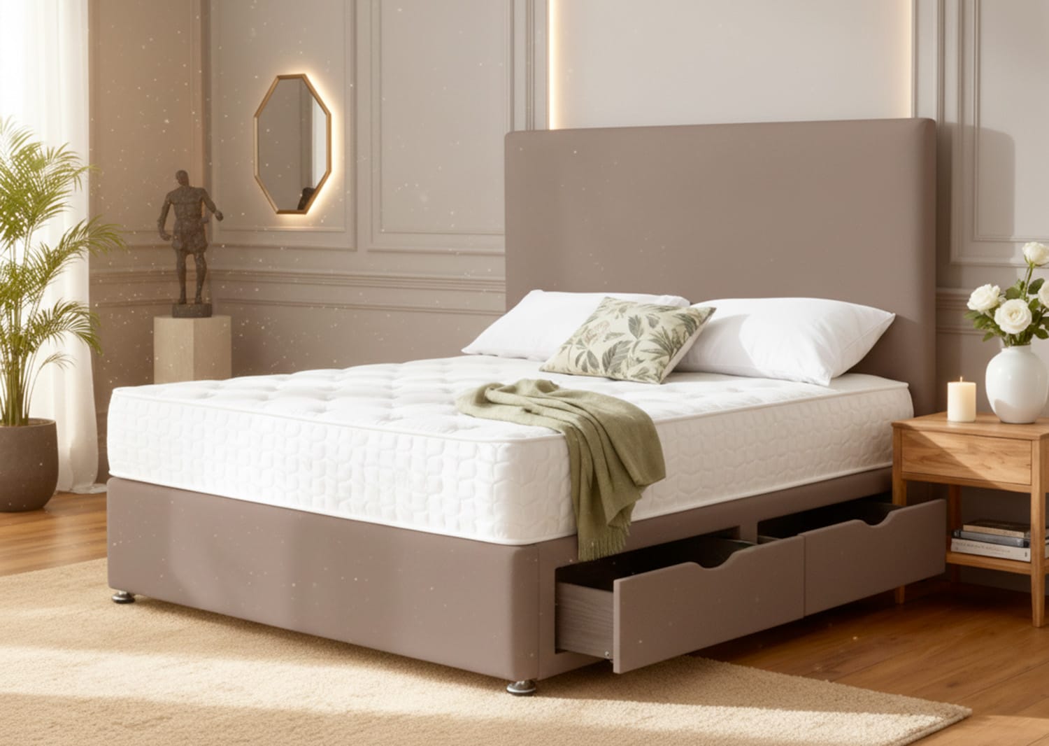 Starting from just £399, this divan bed set proves that quality doesn’t require a premium price tag. The combination of practical storage, comfortable sleeping surface, and customisable aesthetics makes it an intelligent investment for any home.