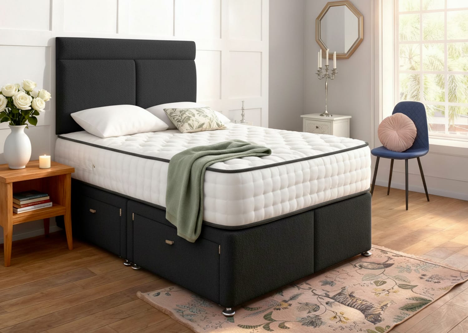 The Lazuli Divan Bed Set transforms ordinary bedrooms into organised, stylish retreats. Its practical storage solutions eliminate bedroom clutter, whilst the contemporary design creates a focal point that enhances your room’s overall aesthetic. Experience the perfect balance of form and function with this exceptional bed set.