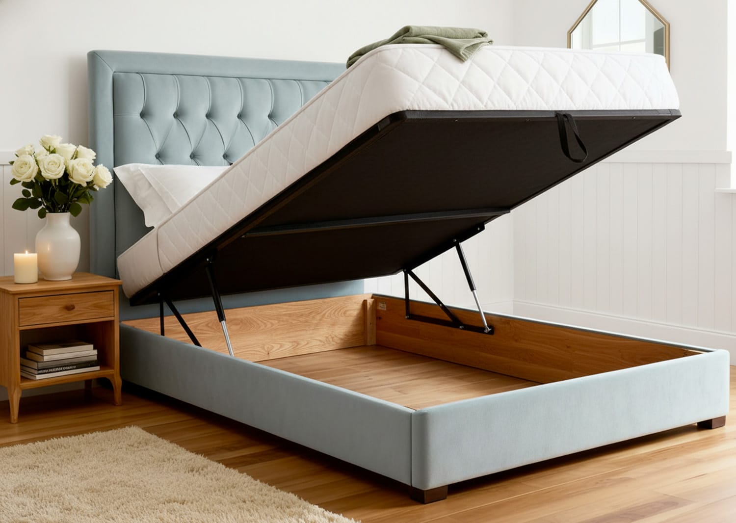 Gas-Lift Storage System Choose between side lift or end lift configurations, each featuring a smooth gas-lift mechanism that provides effortless access to generous hidden storage space beneath your mattress. No more struggling with heavy lifting – simply raise the base with minimal effort.